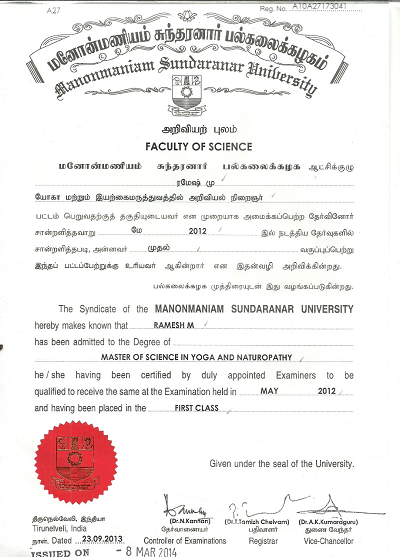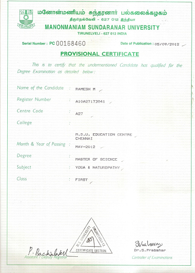 M.Sc. (Yoga and Naturopathy) Master Degree from Dr.Asana Andiappan College of Yoga & Research Institute (Manonmaniam Sundaranar University), Chennai during May 2012.