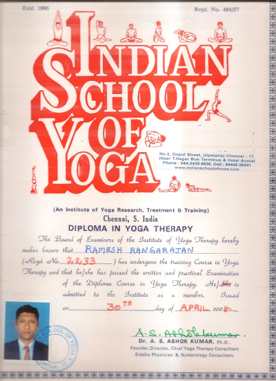 DYT ( Diploma in Yoga Therapy) From Indian school of Yoga T.Nagar Chennai. During 2008